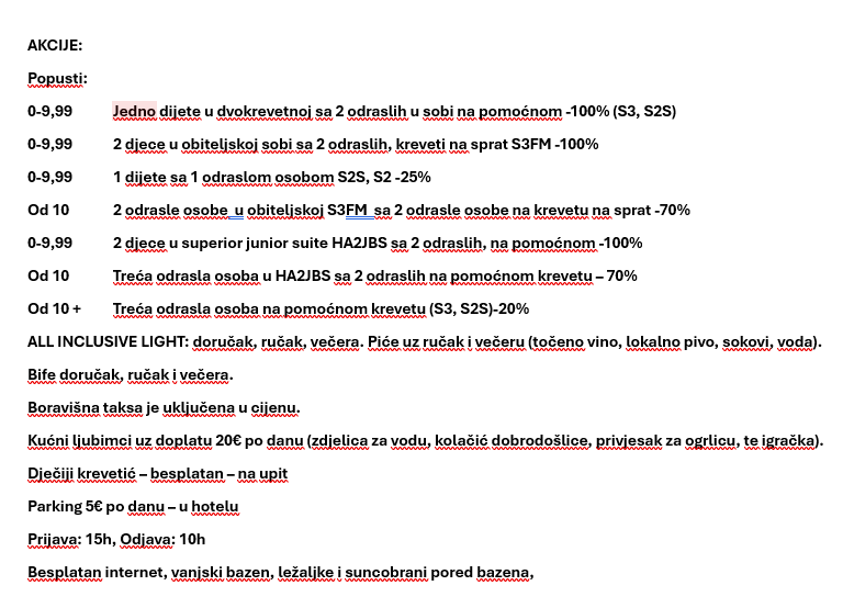 CIJENE SU IZRAŽENE PO OSOBI/NOĆI U KM, USLUGA ALL INCLUSIVE LIGHT